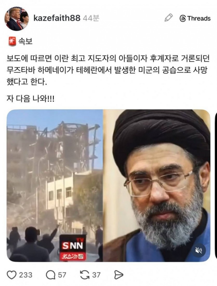(속보) 하메네이 아들 사망 작성자 정보 81b20880 작성 작성일 2026.03.04 21:14 컨텐츠 정보 343 조회 0 추천 0 비추천 목록 본문 사망.. 0 추천 0 비추천 SNS 공유 관련자료 이전 BTS 공연 앞두고 갤럭시 대여 증가 작성일 2026.03.20 21:58 다음 속보) 이란 미친 사우디 아람코 시설 공격 ㄷㄷㄷ 작성일 2026.03.02 17:37 댓글 0 등록된 댓글이 없습니다. 로그인한 회원만 댓글 등록이 가능합니다. 목록