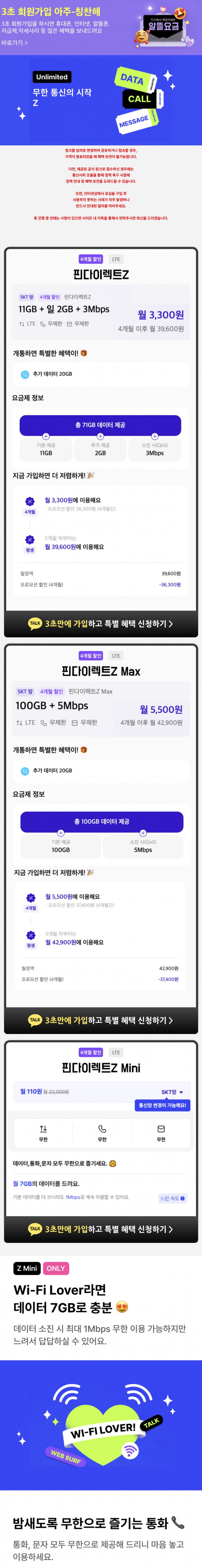 [핀다이렉트] 최저가갱신 7기가+1mps 100원, 71기가 3300원, 100기가 5500원